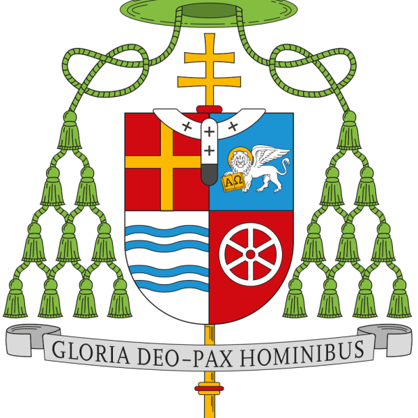 Typische heraldische Nebenstücke umrahmen das Wappen, so der breitkrempige Klerikerhut (Galero) mit Quasten (Fiocchi). Die Farbe von Hut und Quasten sowie deren Anzahl zeigen den Rang an: Das Wappen eines Erzbischofs hat einen grünen Hut und 20 grüne Quasten. Das doppelte Kreuz hinter dem Wappenschild zeigt ebenfalls den Rang als Erzbischof an.
